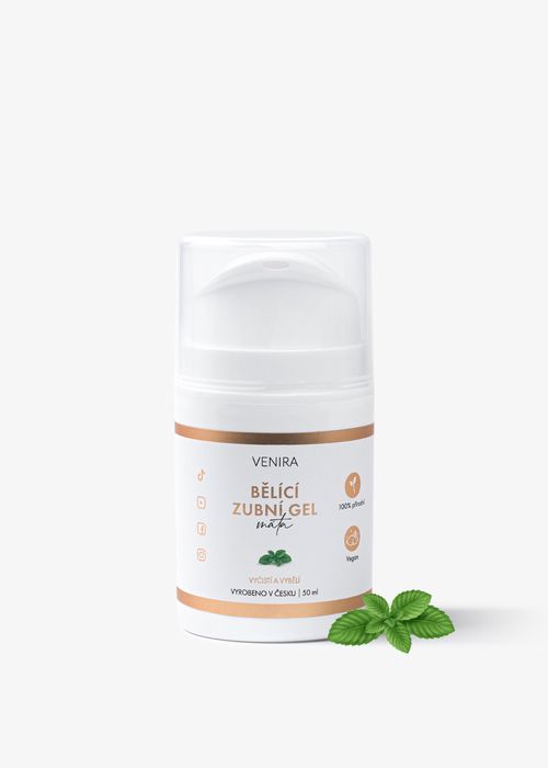 Bílý úsměv jako nikdy předtím! Vyzkoušejte náš gel, který napomáhá vybělit přirozenou barvu zubů o 1 - 1,4 odstíny díky speciálně povrchově upraveným minerálům. Dokonale šetrný bělící zubní gel nenarušuje přirozenou zubní sklovinu, eliminuje nedokonalosti jako jsou skvrny od kávy nebo kouře na minimum. Pro koho je tento vhodný?Bělící zubní gel je vhodný pro každého, koho trápí nažloutlý tón zubů nebo nejrůznější nedokonalosti jako jsou například skvrny od kávy, kouře a dalších. Gel má jemnou mátovou příchuť, takže zanechá příjemně svěží dech! Svým složením je 100% přírodní, veganský a navíc ho můžete použít také v kombinaci třeba s dětskými nebo rotačními kartáčky.Jaké problémy řeší?Obsahuje povrchově upravené minerály, které přispívají k viditelnému bělení zubů a redukují nažloutlé tóny zubů na naprosté minimum. Navíc také pomáhá eliminovat nejrůznější nedokonalosti zubů jako jsou například skvrny od kávy nebo kouře, přičemž je maximálně šetrný a nenarušuje přirozenou zubní sklovinu. Jaký bude výsledný efekt při pravidelném užívání?Gel o naši ústní dutinu účinně pečuje, odstraňuje zubní plak, důkladně zuby vyčistí a zanechá je neodolatelně vyleštěné. Díky pravidelnému používání (3x denně během 30 dnů) zároveň napomáhá vybělit přirozenou barvu zubů o 1 - 1,4 odstíny.Jaké účinné látky obsahuje?Do bělícího zubního gelu jsme zakomponovali vysoce účinné a speciálně povrchově upravené minerály, díky kterým má bělící zubní gel své blahodárné účinky! Kolikrát denně mám gel užívat?Naneste přiměřené množství zubního gelu na kartáček a jemnými krouživými pohyby si zuby vyčistěte. Přebytečné množství vyplivněte a ústa důkladně vypláchněte vodu.Díky příjemné mátové příchuti zanechá neodolatelně svěží dech.Je produkt veganský?Ano! Bělící zubní gel je veganský a navíc byl speciálně navržen tak, že má 100% přírodní složení. Upozornění: Pro kosmetické použití. Obsahuje organické suroviny. Dermatologicky testováno. Skladování: Skladujte v chladu a temnu, při teplotě 8 - 25 °C, mimo dosah dětí.Vyrobeno v ČR.