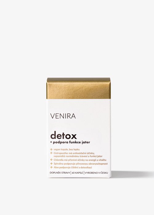 Venira detox je komplexní přírodní přípravek, který napomáhá tělo detoxikovat a očistit ho od škodlivých látek. Čas od času se cítíme nafouklí, unavení nebo nás trápí různé kožní problémy. To vše může být známkou toxických látek v našem organismu. Venira detox napomáhá zbavit se těchto látek, abychom se zase cítili svěže a fit. Proč Venira detox?Je vám těžko od žaludku, cítíte se nafouklí, trápí vás únava a necítít se dobře ve svém těle? Pak je čas na očistu - detox. A to nemyslíme nic drastického. Venira detox je čistě přírodní produkt a bez chemie! Venira detox je komplex několika bylin, které napomáhají zbavit tělo škodlivých látek. Žádná chemie, která by vám mohla ublížit. Detox napomáhá zbavovat tělo a organismus toxických látek, které se v organismu nahromáždily - třeba špatnou životosprávou nebo častým stresem. Bonusem je, že detox pozitivně ovlivní také vaši psychiku. Když se budete cítit fyzicky fit, pak to ocení i vaše psychika a zbavíte se zbytečního stresu. Venira detox napomáhá se cítit opět svěže, fit...prostě dobře!Náš Venira detox navíc obsahuje látky, které se podílí kromě očisty organismu také na správné funkci jater. Příznaky zaneseného organismu:- špatné trávení, nadýmání- únava, bolesti hlavy, vyčerpání, deprese- ospalost, pocity těžkosti, svalová slabost- stres, výkyvy nálad- vyrážky, ekzémy Co vám Venira detox přinese?- napomáhá čistit organismus- budete se cítit více fit, svěží - pomáhá zlepšit psychiku- napomáhá organismu lépe se léčit a regenerovat - odstraňuje toxické látky z těla- napomáhá lepšímu trávení Obsahuje:Ostropestřec – antioxidant, napomáhá normálnímu trávení a funkci jater, pročištění, přispívá k normální hladině cukru v krvi a k přirození činnosti srdce, přirozená obranyschopnost – odolnostCholin – přispívá k normálnímu metabolismu lipidů, udržení normální činnosti jater a k normálnímu metabolismu homocysteinuChlorella – přispívá k vitalitě, energii a přirozená obranyschopnost, napomáhá k normální funkci střevního traktu, mikrobiální rovnováze, je antioxidantSpirulina – je antioxidant, přispívá k normální hladině cukru v krvi, k přirozené obranyschopnosti a posílení imunitního systému, dále přispívá k vitalitě a kontroluje tělesnou hmotnost, mimo jiné podporuje tvorbu svalové hmotyPampeliška – podporuje normální činnost jater, metabolismus sacharidů, normální funkce močové soustavy, normální trávení, normální činnost žaludku a jater a je také antioxidantemAloe – podporuje přirozenou obranyschopnost – posiluje imunitní systém, je antioxidant, podporuje čištění a detoxikaci Jak se do těla dostávají toxiny?Ač se to nemusí zdát, tak toxiny se do našeho těla dostávají zcela jednoduše a to třeba přes potraviny, které každý den konzumujeme. Jsou to také různé polotovary, které obsahují barviva a konzervanty. To pro naše tělo není přirozené ani zdravé a dochází k postupnému zatěžování organismu škodlivými látkami. Toxiny obsahuje třeba také nekvalitní pitná voda, všudypřítomné plasty a nebo zanesené ovzduší. Našemu tělu neprospívají ani špatné a nepříjemné emoce a zlost. Naše tělo si tohle všechno sbírá a ukládá a s postupem času nás toxiny můžou i zdravotně ohrožovat. Proto je zcela nezbytné nás organismus od nich očistit. Kromě našeho Venira detoxu můžete podpořit očistu těla také doplňky stravy, které jsou silnými antioxidanty. Skvělým antioxidantem je Venira lipozomální vitamin C a Venira beta karoten. Kolik kapslí mám denně užívat?Užívejte 2 kapsle denně. Doporučujeme 1 kapsli ráno před jídlem a 1 kapsli večer před jídlem.Jak dlouho mám Venira detox užívat?Venira detox je přírodní dopněk stravy a je možné ho užívat dlouhodobě.
